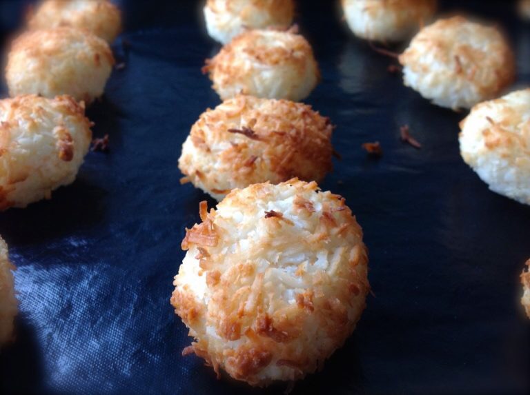 Line a baking tray with a non stick liner or baking paper. Roll a spoonful of macaroon mixture into a small firm ball and place evenly on the baking tray.