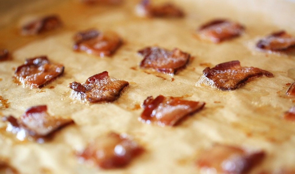 Cut bacon rashers into rough 2" squares(4cm), spread on a lined baking sheet
