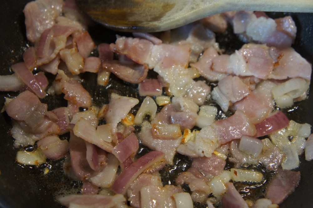 3. Heat butter in pan and fry onions and bacon until onions are beginning to soften