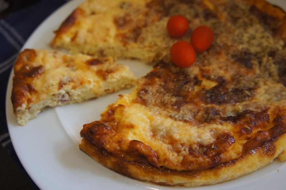 5. In a greased cake tin or a silicone one spread onions, bacon and 3/4 of the cheese over the bottom of your baking tin