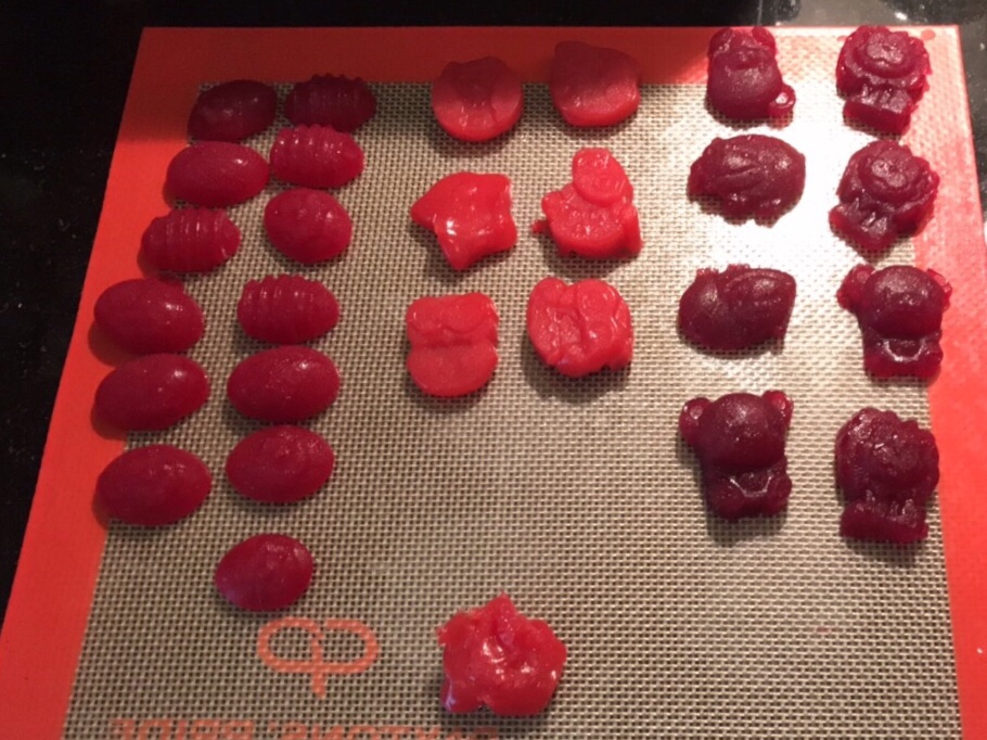 My first try at making gummy sweets, not bad seeing as how I’m usually a total disaster area where gelatine is concerned… maybe I’ve beaten the curse.