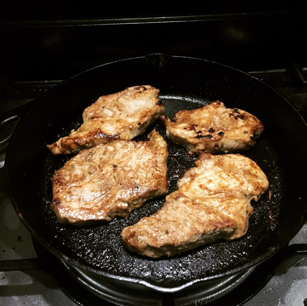 Cook in skillet on each side until the pork is cooked through, probably no more than 15 to 20 mins, remember it is acceptable to eat pork slightly pink nowadays so don’t cook it until it’s dry and tough.