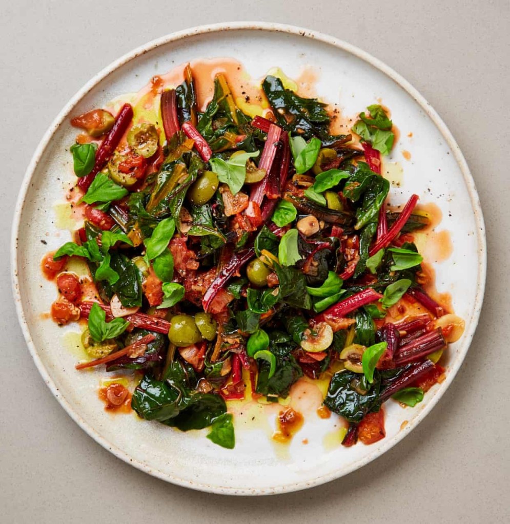 Cut any wider chard stalks in half lengthways (or three times, if they are especially wide). Put a large saute pan on a medium-high heat with a teaspoon of oil, add the chard stalks and saute, stirring occasionally, for four minutes. Stir in the leaves and saute for another three minutes, until just wilted and cooked. Transfer to a large bowl, cover with a plate, leave for three minutes to soften further in the residual heat, then remove the plate.