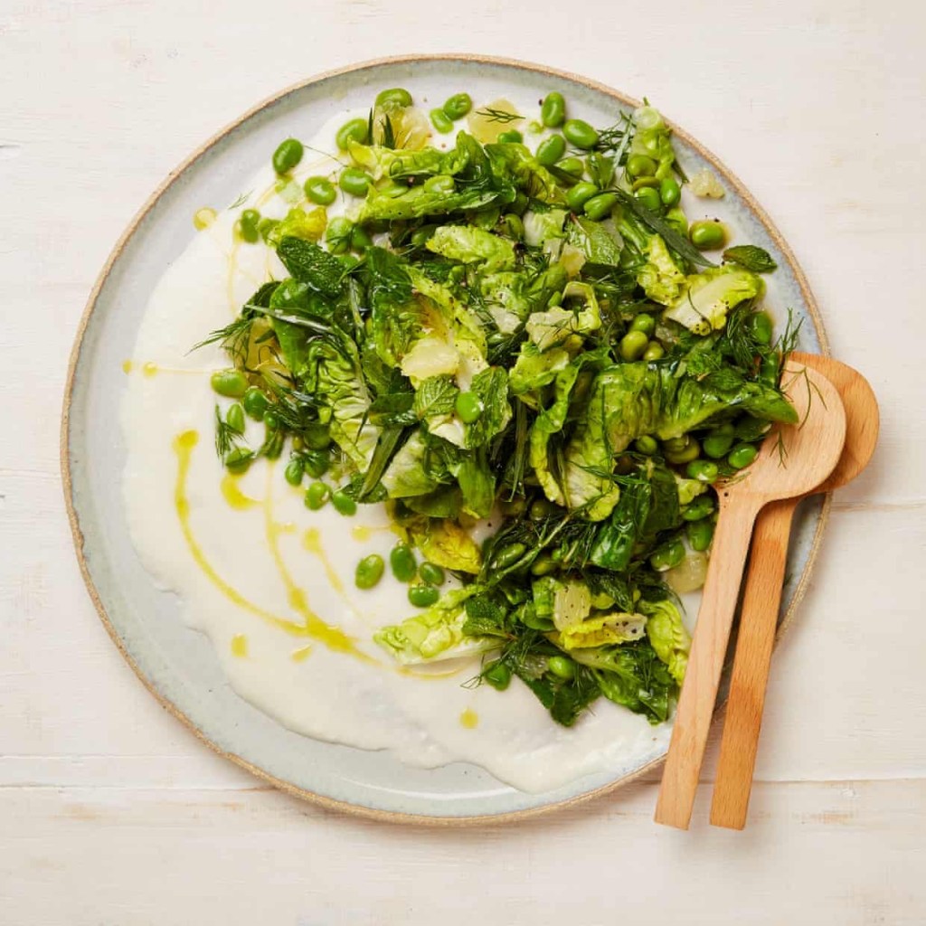 Segment the lemon by using a small, sharp knife to top and tail it. Cut down around its curves to remove the skin and white pith, then release the segments by cutting between the membranes. Roughly chop the segments into three or four pieces, put them in a large bowl, then squeeze the juice from what’s left of the membrane into the bowl (you want about a teaspoon of juice in all). Add the broad beans, lettuce, herbs, two tablespoons of olive oil, a quarter-teaspoon of salt and a good grind of pepper, and toss to combine.